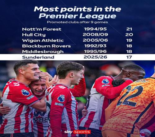 赛后来自天空体育的统计指出,桑德兰本赛季英超前9轮拿到了17分,这样的成绩能够排在英超历史升班马联赛同期的第6位,仅次于1994-95赛季的诺丁汉森林(9轮21分)、2008-09赛季的赫尔城(9轮20分)、2005-06赛季的维冈竞技(9轮19分)、1992-93赛季的布莱克本流浪者(9轮18分)以及1995-96赛季的米德尔斯堡(9轮18分)。